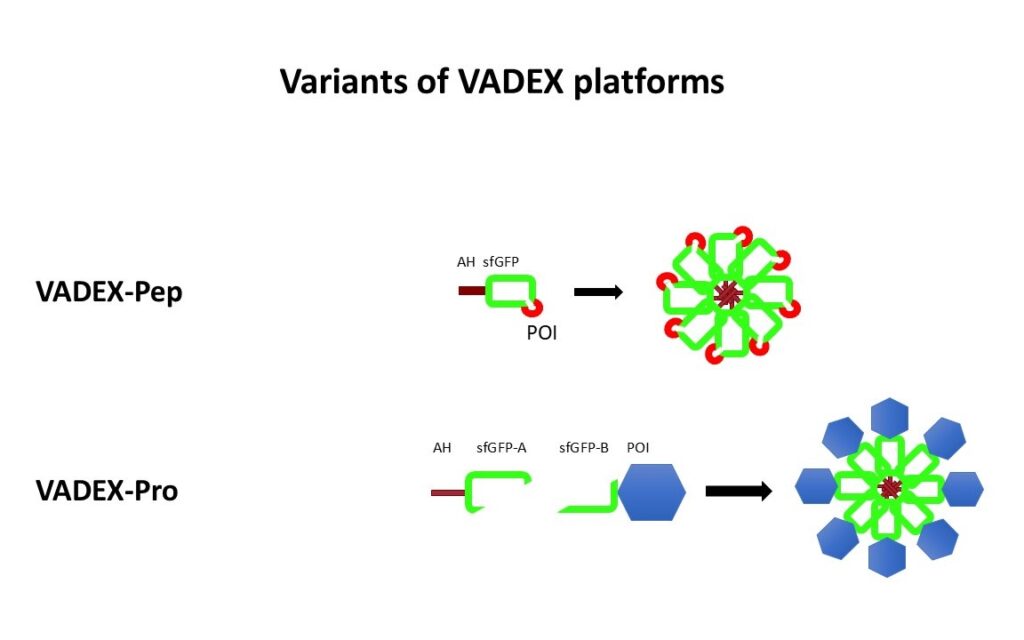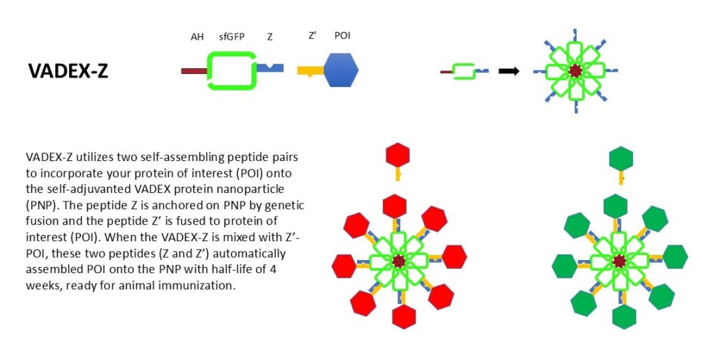 核心技術 VADEX-Pep 適用於表現胜肽的VADEX載體. VADEX-Pro 適用於表現蛋白的VADEX載體. VADEX-Z 萬用型自佐劑蛋白奈米粒子, 可以和任何帶有Z’胜肽自行組合成蛋白奈米粒子